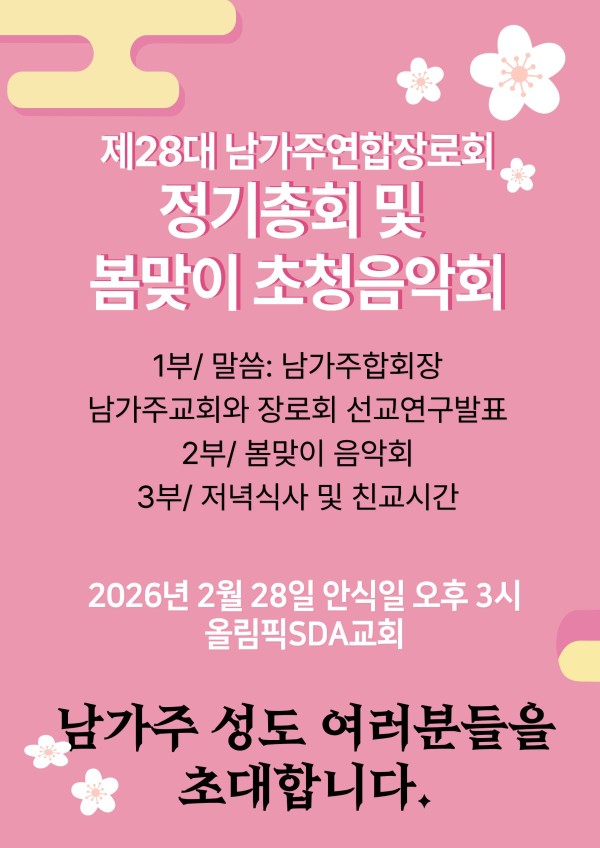 지역교회 제 28 대 남가주연합장로회 정기총회 및 봄맞이 초청음악회 페이지 정보 작성자 KCAMD쪽지보내기 메일보내기 자기소개 아이디로 검색 전체게시물쪽지보내기 메일보내기 자기소개 아이디로 검색 전체게시물 작성일2026.01.26 18:05 조회수 51 글씨크기 + - 본문 제 28 대 남가주연합장로회 정기총회 및 봄맞이 초청음악회 추천 0 페이스북 공유 트위터 공유 다음글B.M.W. Newsletter 12월호 26.01.16 댓글 0 댓글목록 등록된 댓글이 없습니다. 목록